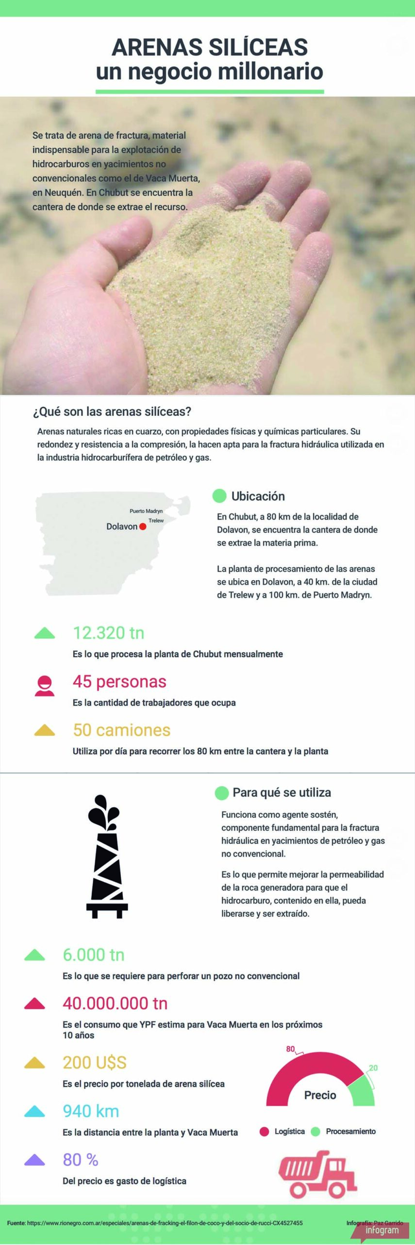 Es un eslabón fundamental en la industria del petróleo no convencional. Un pozo estándar requiere de alrededor de 3.000 toneladas, inyectadas junto a miles de litros de agua y químicos para resquebrajar las rocas del subsuelo y extraer crudo o gas a la superficie. Se estima que un buen pozo horizontal necesitaría 6.000 toneladas de arena.